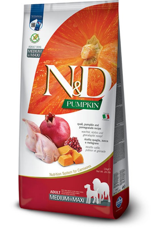 CHICKEN, PUMPKIN AND POMEGRANATE PUPPY MEDIUM & MAXIHrana za vašega psa > N&D Pumpkin za pseChicken, Pumpkin and Pomegranate Puppy Medium & Maxi NA VOLJO V PAKIRANJIH 2,5 KG - 12 KGRecept s piščancem, bučo in granatnim jabolkom.Popolna hrana za pasje mladiče, breje psice in psice v laktaciji.SESTAVAPiščanec brez kosti (24%), dehidrirane piščančje beljakovine (24%), grahov škrob, piščančja maščoba, dehidrirane sledove beljakovine, posušena buča (5%), sled, posušena jajca, ribje olje (sledovo), grahove vlaknine, posušeno korenje, lucernina moka, piščančji hrustanec (vir glukozamina in hondroitin sulfata), inulin, frukto-oligosaharidi, izvleček kvasa (vir manno-oligosaharidov), posušeno granatno jabolko (0.5%), posušena špinača, lupine in semena psiliuma (0.3%), posušeno jabolko, posušena sladka pomaranča, posušene borovnice, natrijev klorid, posušene pivovarske kvasovke, kurkuma (0.2%), izvleček aloe vereSESTAVINE IN PREHRANADODATKI NA KGDodatki na kg - Nutritivni dodatki: vitamin A 16000IU; vitamin D3 1600IU; vitamin E 600mg; vitamin C 160mg; niacin 40mg; kalcijev D-pantotenat 16mg; vitamin B2 8mg; vitamin B6 6.4mg; vitamin B1 4.8mg; biotin 0.40mg; folna kislina 0.48mg; vitamin B12 0.1mg; holin klorid 2800mg; beta-karoten 1.5mg; cink (cinkov kelat hidroksiliranega analoga metionina) 163.8mg; mangan (manganov kelat hidroksianaloga metionina) 64.6mg; železo (železov (II) kelat iz hidrata glicina) 58.3mg; baker (bakrov kelat hidroksiliranega analoga metionina) 15.8mg; selen (selenizirana inaktivirana kvasovka) 0.00088mg; DL-metionin, tehnično čist 6000mg; tavrin 1000mg; L-karnitin 300mg. Senzorični dodatki: izvleček zelenega čaja 100mg; izvleček rožmarina. Antioksidanti: izvlečki tokoferola iz rastlinskih olj.ANALITIČNE SESTAVINESurove beljakovine 35.00%; surove maščobe 20.00%; surova vlaknina 1.90%; vlaga 9.00%; surovi pepel 7.80%; kalcij 1.10%; fosfor 0.91%; omega-6 3.40%; omega-3 0.90%; DHA 0.50%; EPA 0.30%; glukozamin 1400mg/kg; hondroitin sulfat 1100mg/kgENERGIJSKA VREDNOSTEM Kcal/Kg 4150 - Mj/Kg 17,36