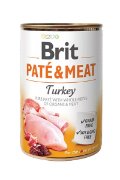 BRIT PATE & MEAT - PURANPopolna in uravnotežena hrana. Brez žit in konzervansov. Čista pašteta s celimi kosi organov in mesa. 70% puran in piščanec. Pakiranja: 400g.Sestava: 44% piščanec (meso in organi), 26% puran (meso in organi), 3% grahov škrob, 1% vlaknine graha, 0,5% lososovo olje. Analitske sestavine: surove beljakovine 9,00%, surove maščobe 5,00%, surovi pepel 3,00%, vlaga 78,00%, , surova vlaknina 0,50%, kalcij 0,1%, fosfor 0,3%, natrij 0,2%. Prehranski dodatki/kg: vitamin D3 (E671) 250 IU, vitamin E (3a700) 100 mg, cink (3b606) 15 mg, železo (3b106) 10 mg, mangan (3b504) 3 mg, kalijev jodid (3b201) 0.75 mg, baker (3b406) 0.5 mg, biotin (3a880) 0.2 mg. Tehnološki dodatki/kg: rožičev gumi (E410) 5.000 mg.